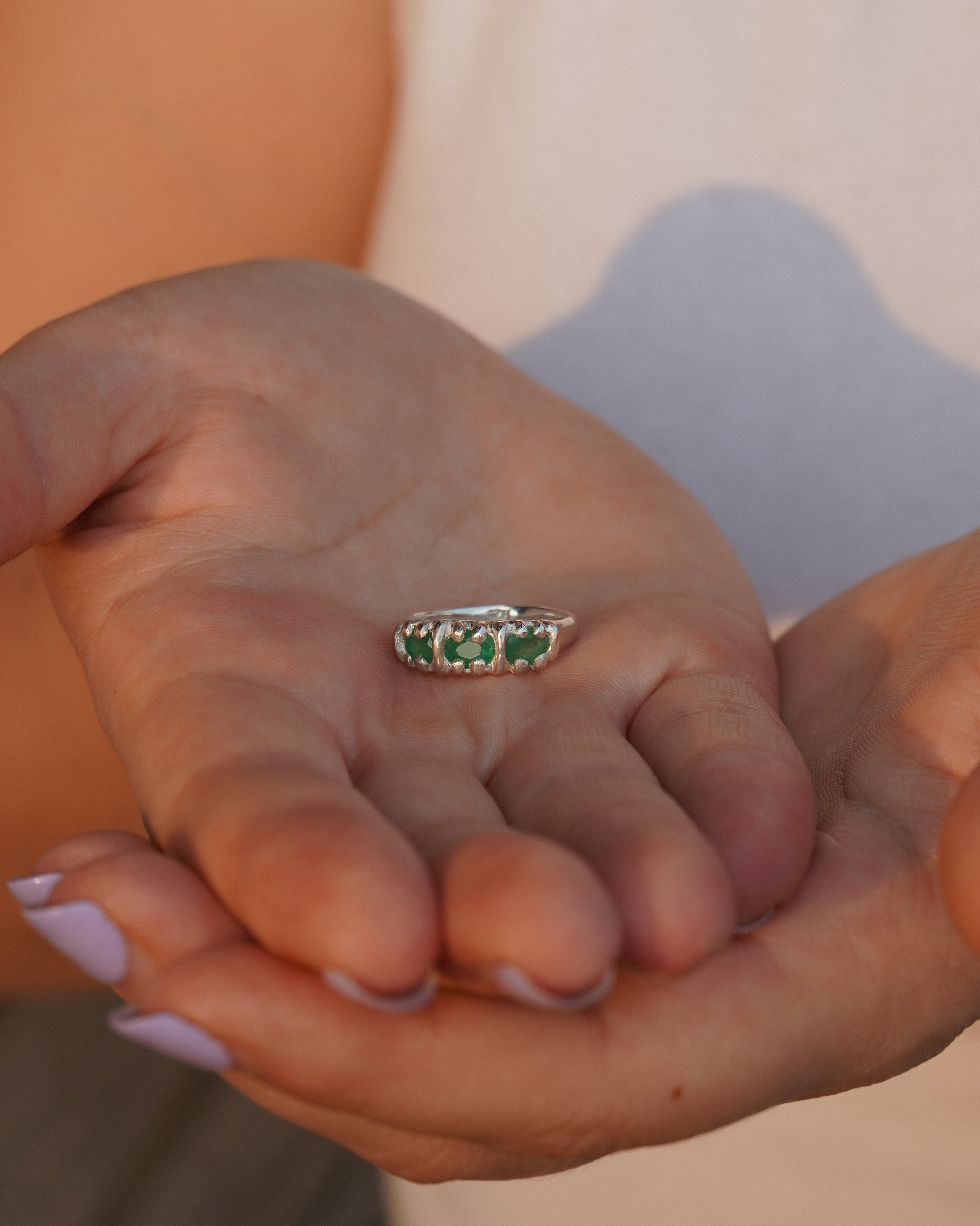 This Zambian Emerald Trio Band ring features three organically set emeralds, each with its own natural character and charm. The sculptural band adds texture and dimension, giving the piece a bold, handcrafted appeal.