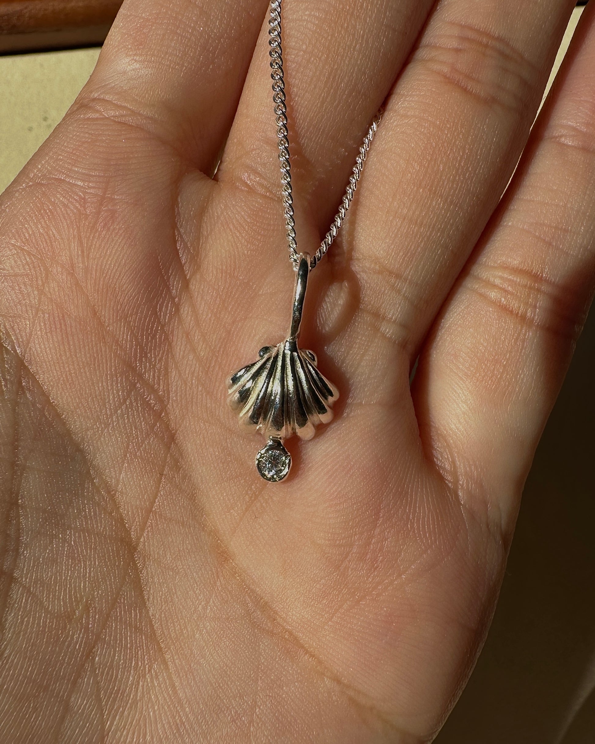 A sculptural seashell cast in sterling silver, paired with a sparkling moissanite drop. This pendant captures the quiet magic of the sea in a minimal, timeless form.